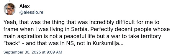These are genuinely decent people, mind you. But Thanatos is stronger than Eros here. There are other aspirations than normal life, and the notion that their destinies are unimportant and that they are born to suffer. No wonder people keep leaving this suicide squad of a country in droves.