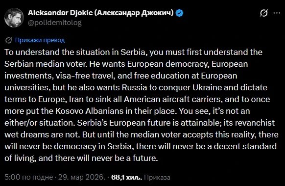 Certainly, the evil European Russophobia that wants to ruin our dear brothers and allies from Russia and rob them of their Greatness. It also feeds the lie that Brussels made Serbia into a paternalist autocracy by remote control, when in fact, people here kept stubbornly voting for it until they got it again.