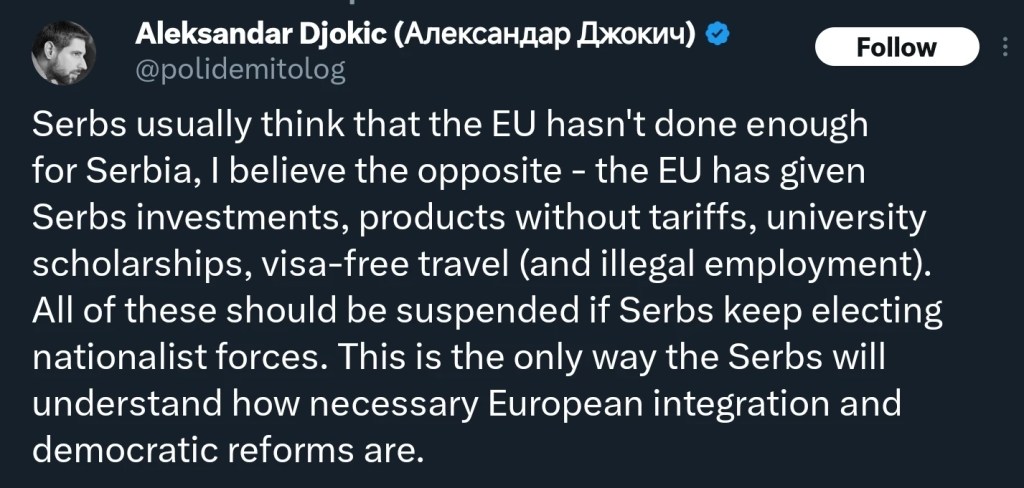 I won’t argue with this assessment of the Serbian electorate one iota. Serbia is the ultimate in “you asked for it, you got it”. Re-elect the demagogues from the 90s to “eliminate corruption, screw over the EU, and preserve Kosovo”, and you end up “enjoying” the Slaanesh of paternalist autocracy.